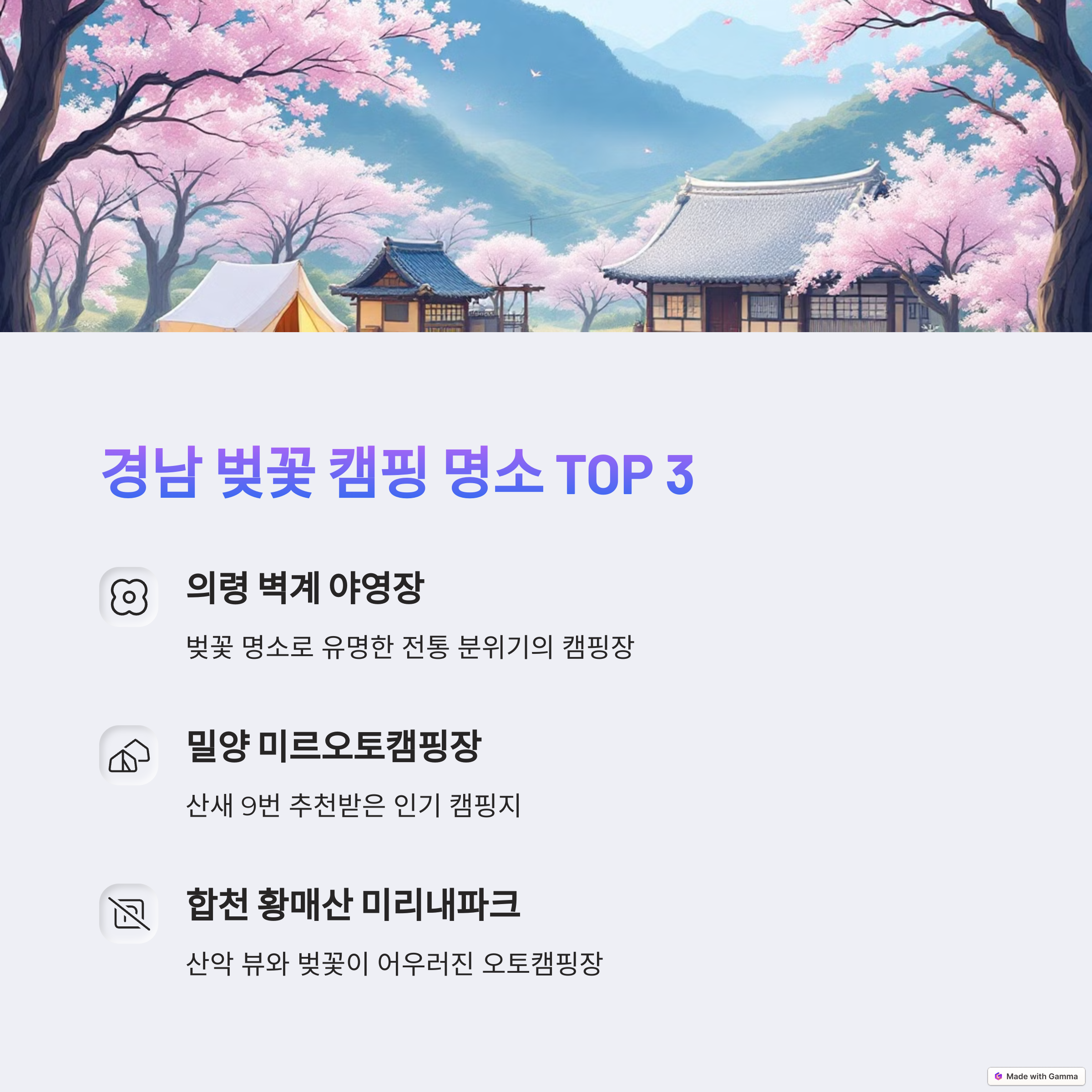 부산, 경남, 울산 지역은 각기 다른 매력을 지닌 캠핑 명소들이 가득한 곳입니다. 유료 캠핑장에서는 편안한 시설과 편의성을, 무료 노지캠핑에서는 자연 그대로의 감동을 느낄 수 있습니다. 벚꽃이 만개한 봄날에 자연과 함께 시간을 보내고 싶다면, 오늘 소개한 캠핑장 정보를 꼭 참고해보세요. 내 취향에 맞는 장소를 찾아 마음껏 즐기시길 바랍니다.