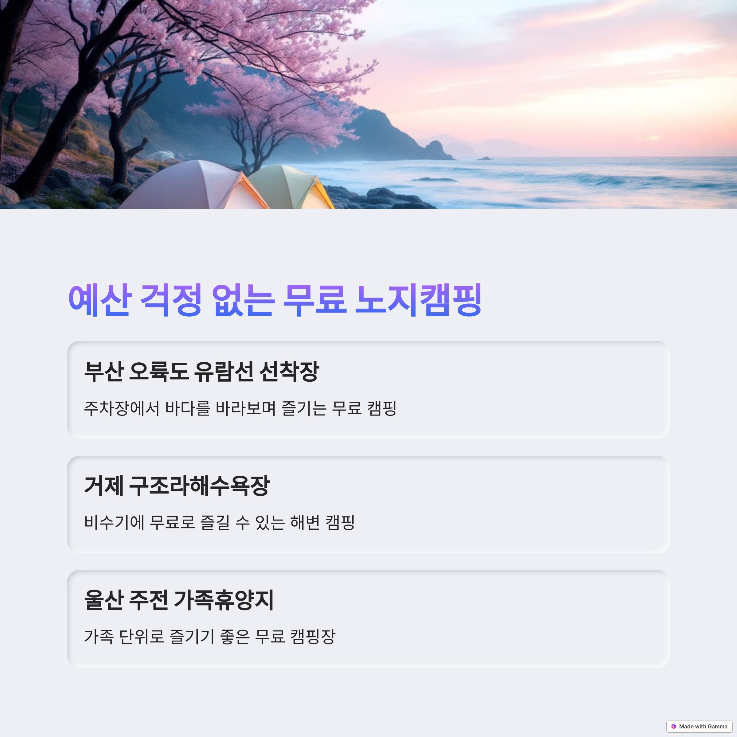무료 노지캠핑 | 오륙도, 거제 구조라해변 등 자유로운 캠핑 가능 |