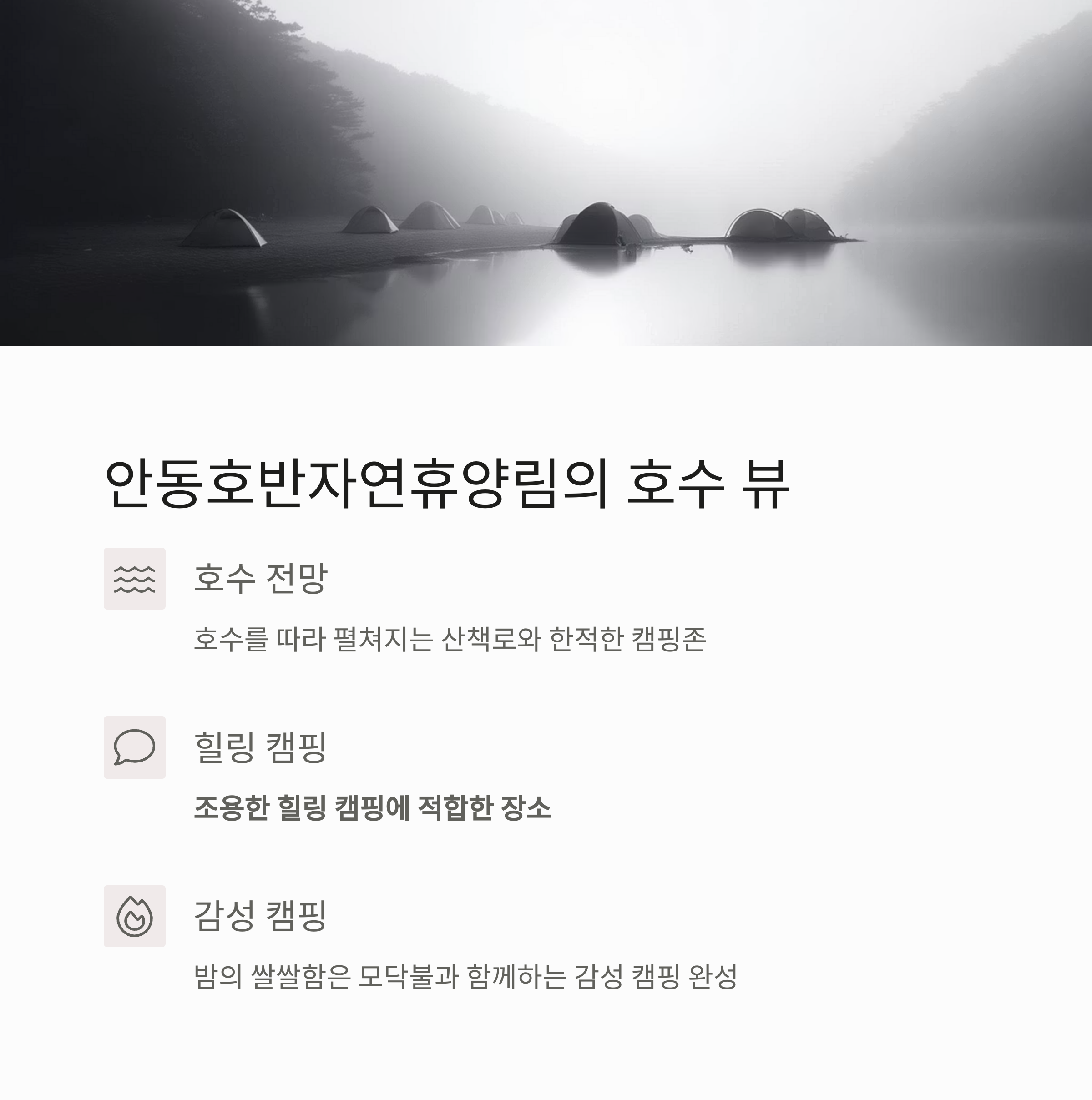 호수를 따라 펼쳐지는 산책로와 한적한 캠핑존이 조화를 이루는 이곳은 조용한 힐링 캠핑에 적합한 장소입니다.