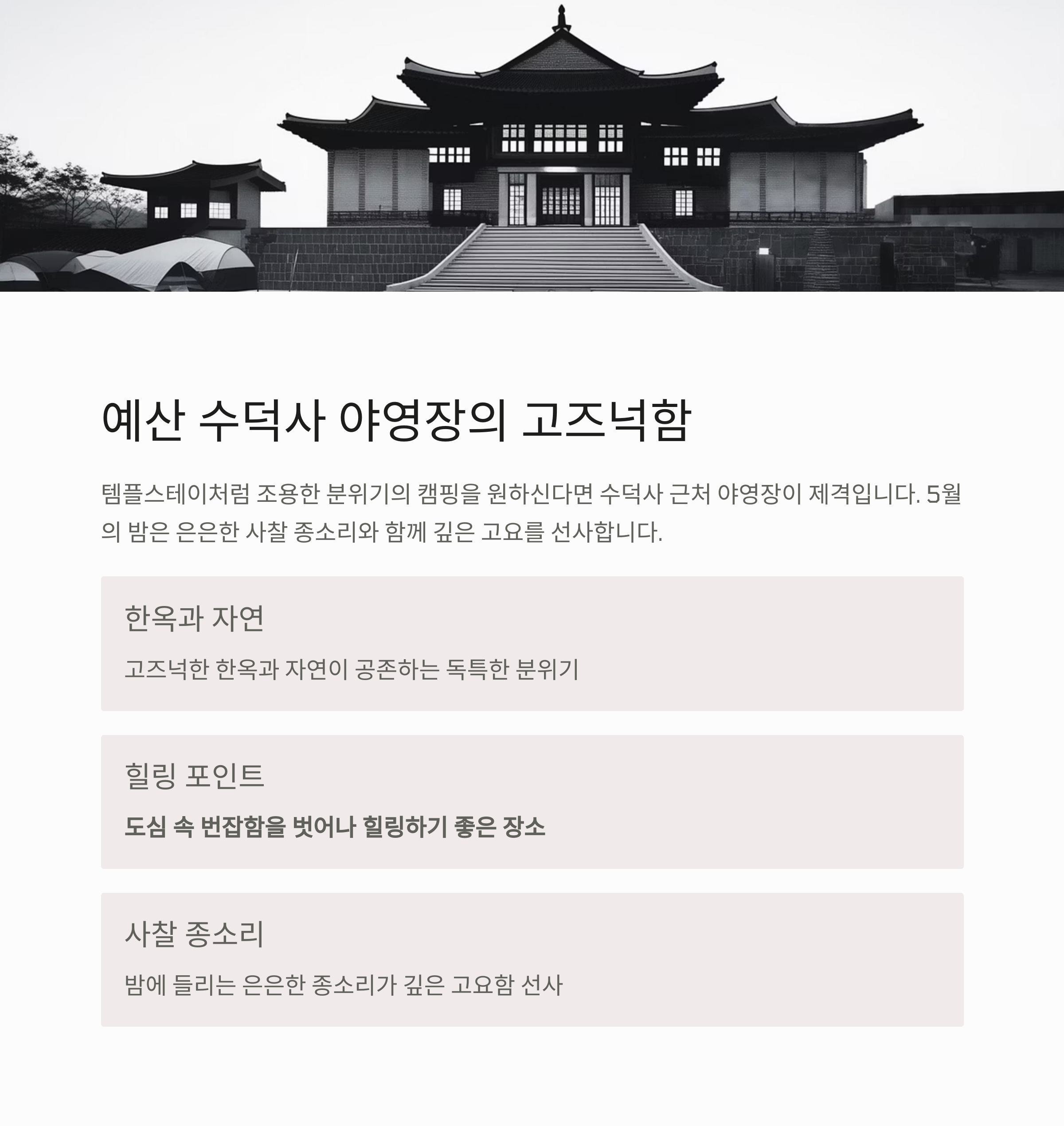 템플스테이처럼 조용한 분위기의 캠핑을 원하신다면 수덕사 근처 야영장이 제격입니다.