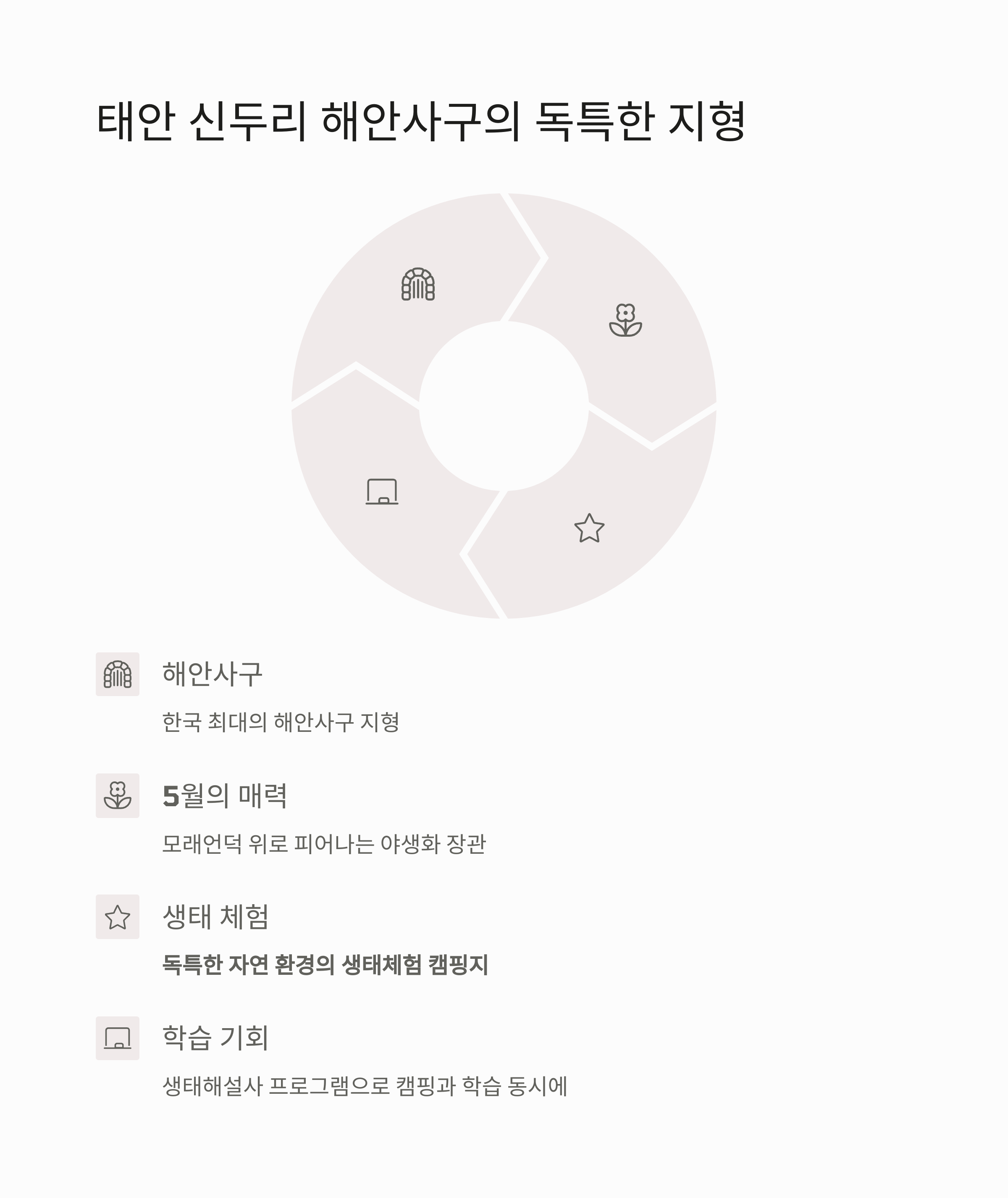 한국 최대의 해안사구 지형인 이곳은 독특한 자연 환경 덕분에 생태체험 캠핑지로도 유명합니다.