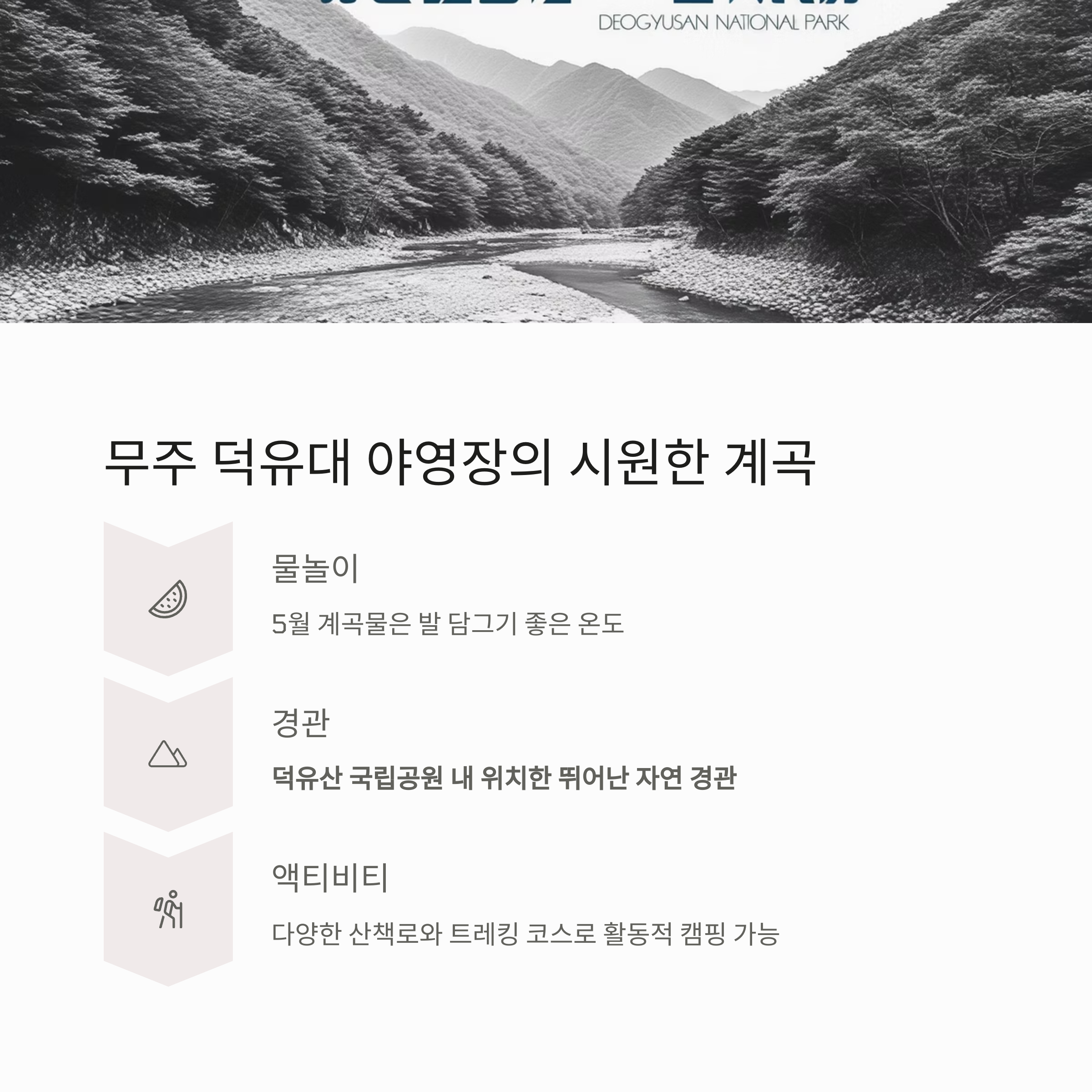 덕유산 국립공원 내 위치한 만큼 경관이 뛰어나며 산책로와 트레킹 코스가 다양해 액티비티 캠핑에 적합합니다.